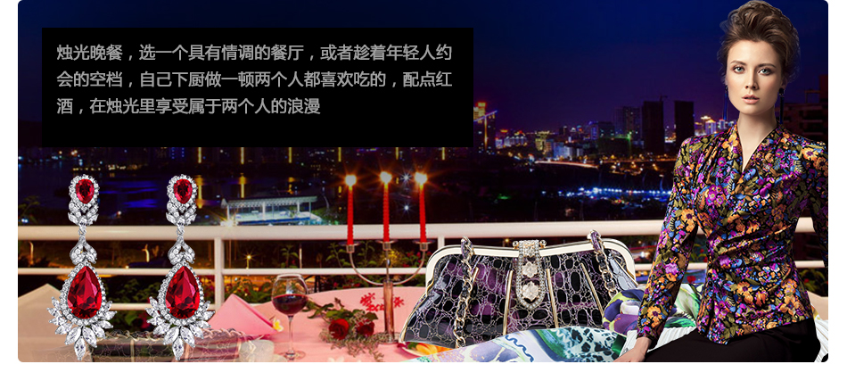正統(tǒng)的西餐廳,小提琴手現(xiàn)場演奏著《小夜曲》,關(guān)于愛情的回憶與這夜色的美好一同沉淀,安靜的餐廳一角,燈光昏黃,紅酒飄香,氣氛正好。新婚的我們怎能不盛裝出席,紀(jì)念這難得的時(shí)光?西裝配禮服,再合適不過的選擇。女士們當(dāng)然也不要忘記戴上心儀的飾品,這夜色,更需要那珠光的色澤為愛情祝賀。