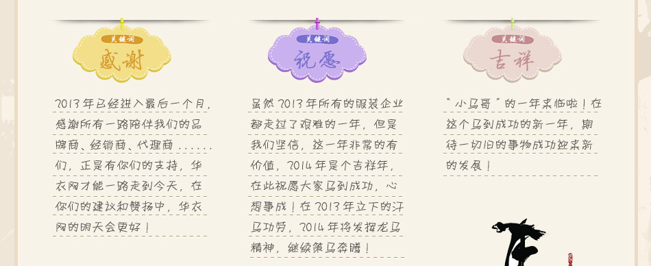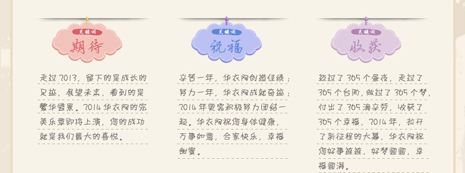 | 服裝媒體是服裝行業(yè)中必不可少的組成部分,也是整個(gè)服裝行業(yè)必不可少的公眾力量。華衣網(wǎng)作為服裝行業(yè)第一網(wǎng)絡(luò)傳媒,在此為2014年服裝行業(yè)送上我們的祝福! |