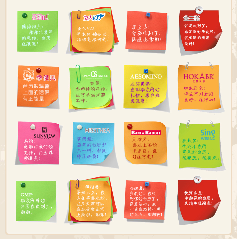 | 華衣網(wǎng)2014感悟正能量主題臺歷,不僅是華衣網(wǎng)回饋廣大服裝品牌的小小心意,同時(shí)也是華衣網(wǎng)為服裝行業(yè)傳遞正能量的重要媒介。您想知道各大服裝品牌在收到華衣網(wǎng)的臺歷后,都說了哪些話呢?一起來看看吧! |