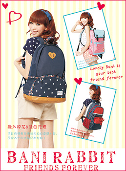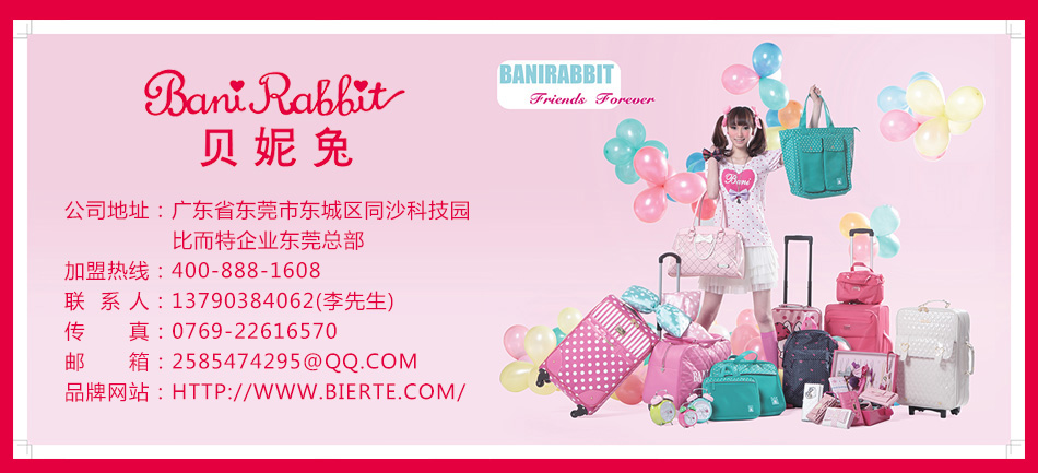 | 大家好!我叫Bani,一只喜歡和可愛時(shí)尚女孩交朋友的小兔子我喜歡限量,追求潮流,熱愛時(shí)尚,憧憬美好…… 我喜歡用靚麗多變的造型讓我的朋友眼前一亮,我,時(shí)而甜美清純?nèi)缧」,時(shí)而純真浪漫如小淑女,時(shí)而知性內(nèi)秀如白領(lǐng),偶爾還會(huì)用一身個(gè)性“COOL”風(fēng),搶盡眼球…… 我要永遠(yuǎn)閃動(dòng)著長長的睫毛,然后嘴角上揚(yáng)微笑;我要把開心,爛漫帶給所有的朋友… 有這樣一只小兔子,臉蛋圓圓的,左耳上扎著一個(gè)小花發(fā)夾,還有一個(gè)始終嘴角上揚(yáng)的小嘴巴,她的名字就叫貝妮(Bani Rabbit)。 Bani1999年出生在比而特的大家庭里,她清純可愛的形象受到了廣大年輕女孩的青睞,以本質(zhì)的卡通流行元素為主導(dǎo),以簡約時(shí)尚為領(lǐng)先,倡導(dǎo)一種開心快樂,富有甜蜜色彩的感性生活。我們設(shè)計(jì)師將可愛的貝妮形象滲透到現(xiàn)實(shí)生活中去:這只卡通小兔子被印在包袋、錢夾、化妝包、服裝及多種精品的商品上,并行銷全國各地,為青春一族的女孩子們帶來了快樂和滿足她們美麗裝扮的愿望。 Bani貝妮兔箱包品牌以速度著稱,她有著對(duì)市場的快速認(rèn)知、快速理解和快速掌握。 Bani選擇包袋類產(chǎn)品做市場切入點(diǎn),并迅速對(duì)產(chǎn)品結(jié)構(gòu)進(jìn)行創(chuàng)新和豐富。目前貝妮兔箱包品牌已涉足包袋、錢夾、服裝、拉桿箱、太陽鏡、拖鞋、精品類產(chǎn)品,并將逐漸對(duì)其進(jìn)行升級(jí)、豐富和創(chuàng)新。 讓可愛的貝妮給無數(shù)少女創(chuàng)造快樂與美麗吧! |