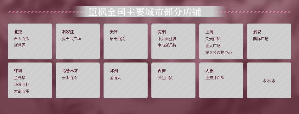 臣楓目標(biāo)消費群年齡定位在35-45歲,中心年齡層是40歲。以政府,學(xué)校等事業(yè)單位的公務(wù)員和企業(yè)中高層管理人員等文職人員為主,有著相對優(yōu)越的生活環(huán)境,具有較高的文化修養(yǎng),品味高雅,成熟自信,秉承自身的穿衣風(fēng)格,向往品質(zhì)化的生活。臣楓女裝以優(yōu)雅時尚獲得了了都市女性消費者的喜愛,因此全國很多臣楓女裝加盟店產(chǎn)品非常暢銷。