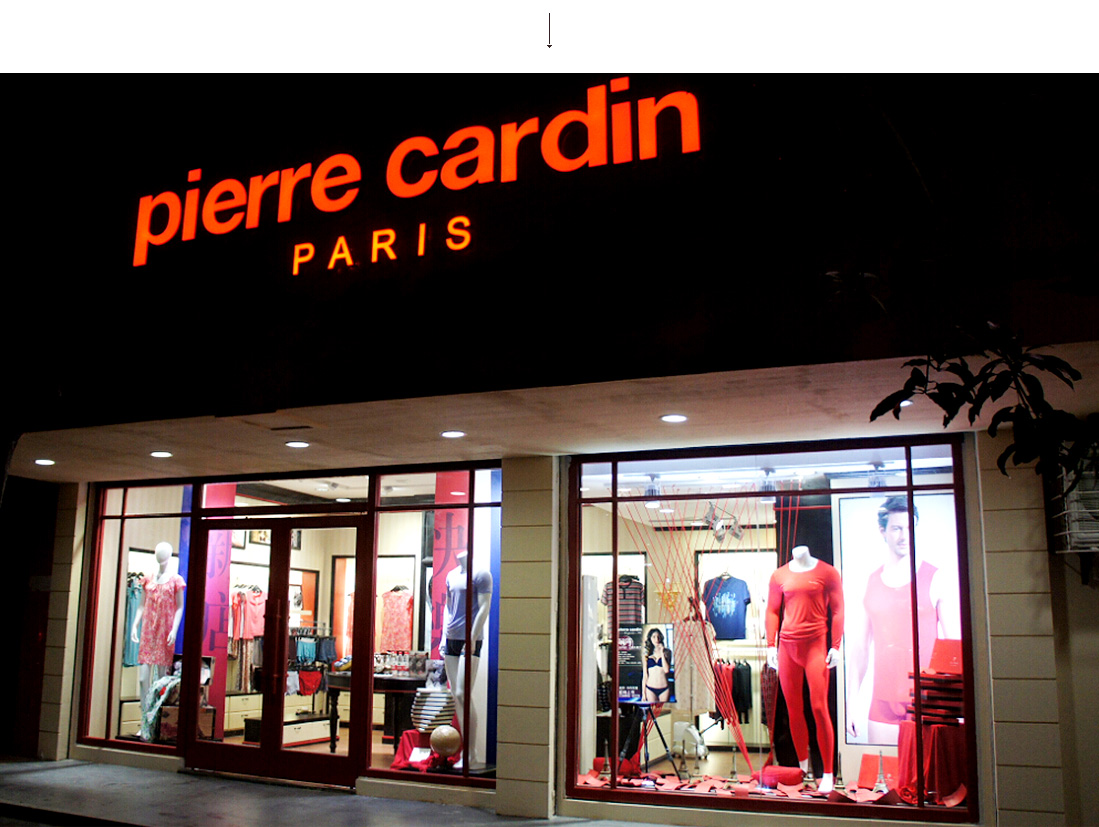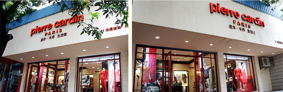皮爾·卡丹(Pierre Cardin)生活館的門(mén)頭,即使是文字亮光部分的邊緣中也呈現(xiàn)著一種紅色的貴氣,
