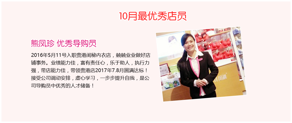 我們每月會推出一名優(yōu)秀店員,記敘她從與閨秘初遇到為閨秘付出自己的精力、貢獻的點點滴滴。