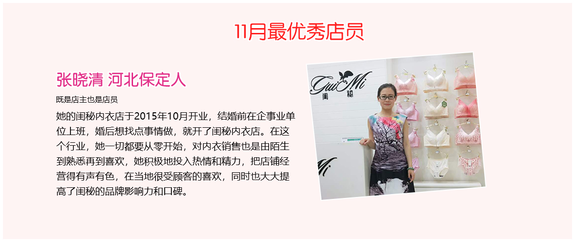 我們每月將推出一家優(yōu)秀店鋪,介紹該店的詳情及店主與閨秘內(nèi)衣品牌之間的不一樣的緣分和故事。